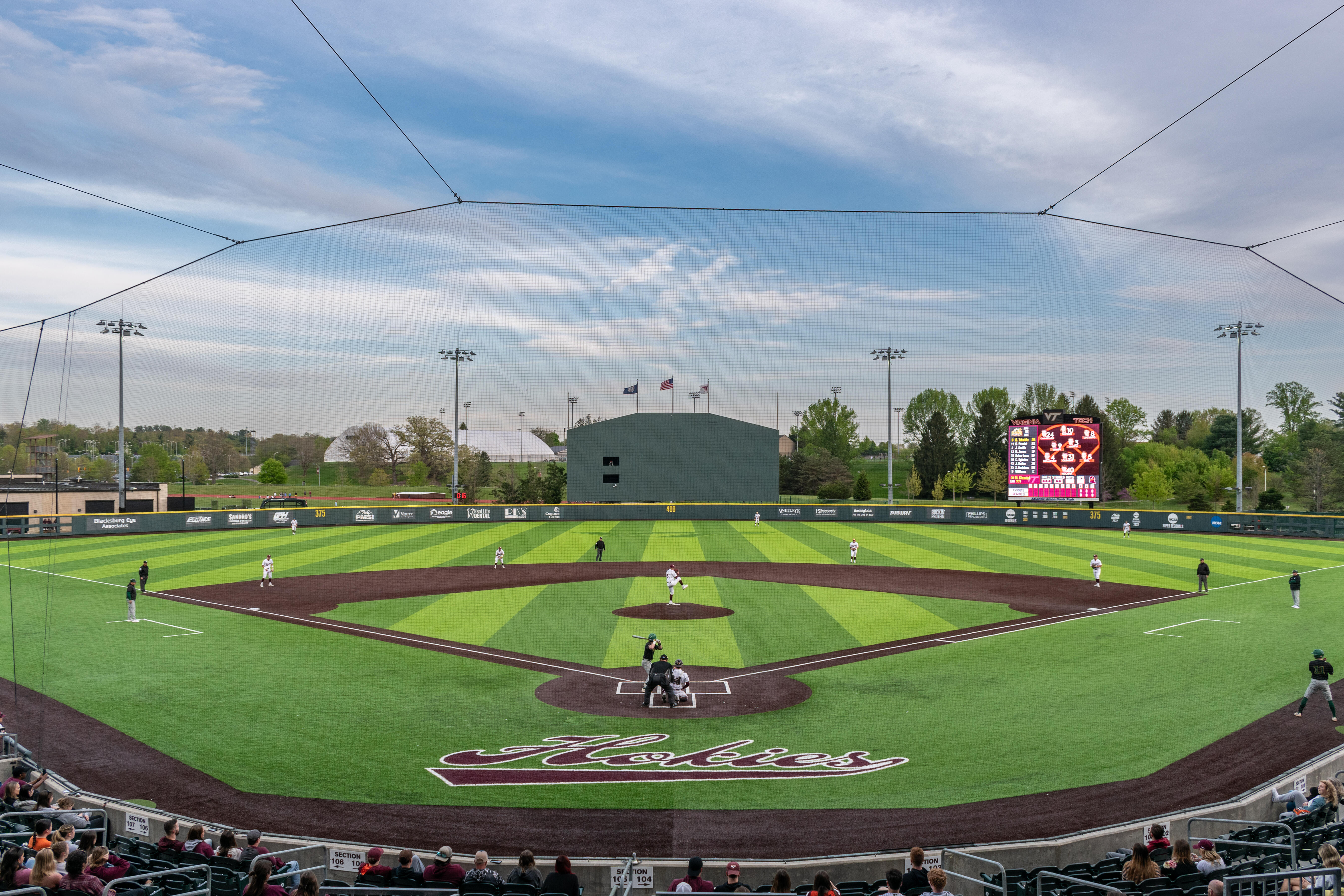 Named for decades-long athletics benefactors and Tech alumni E. R. and Ruth English, the stadium is able to hold more than 4,000 fans throughout its different seating areas. The nearly 1,200 fixed seats behind the plate do not actually make up the largest spectator area at the park; that title belongs to the terraced berm on the third base side known as “The Hill.” With around a dozen long steps allowing for a close-up view of the field, The Hill is a popular place from which to watch a game.