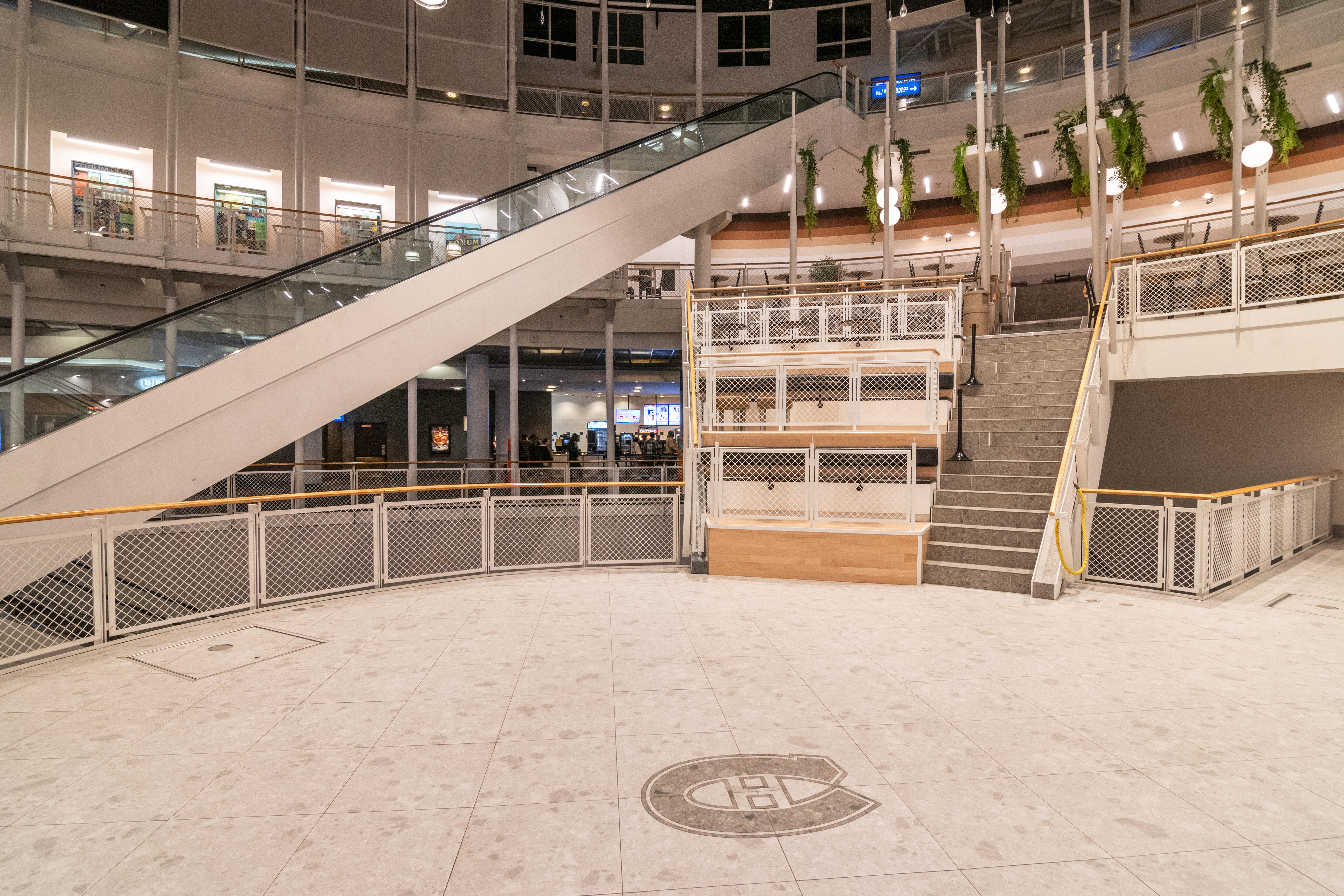 Refurbished seats from the Forum line one of the more history-rich hallways, tucked away on one of the mall’s highest levels, while championship banners and team photos decorate the walls and ceilings. Elsewhere, there’s a special space dedicated to Maurice Richard, arguably the greatest hockey played in the city’s history and a native son of Québec. An old scoreboard hangs in one corner of the mall, while a Canadiens emblem marking center ice on the main level ties everything together.