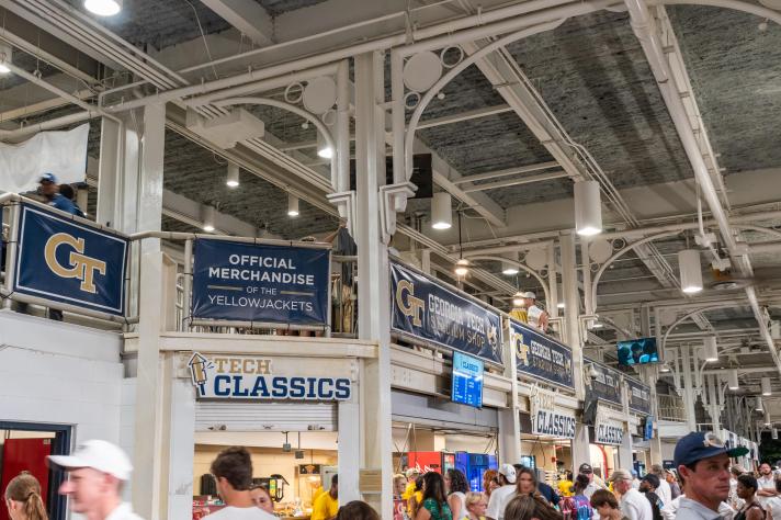 Bobby Dodd Stadium – also known colloquially as “The Flats” – is located at the corner of North Avenue and Techwood Drive, just a block over from Atlanta’s traffic-laden Connector and, from the west and north stands, the landscape is dominated by the skylines of both Midtown and Downtown Atlanta. While the original facility held only 5,600 fans, the stadium has been expanded and renovated on many occasions, with the current capacity hovering at just under 52,000. Built in the 1960s, the modern steel decks on the east and west sidelines brought 14,000 new seats to the then-intimate venue, with the latter being constructed directly atop its concrete predecessor. The most recent seating bowl overhaul was completed in 2003 and saw reconstruction of the stadium’s overall shape, culminating in the addition of a new upper deck in the north end zone. The uneven expansion of the different areas of Bobby Dodd truly lend to its quirky, disjointed shape and creates many nooks and crannies throughout the concourse as fans transition from old to new and back again.