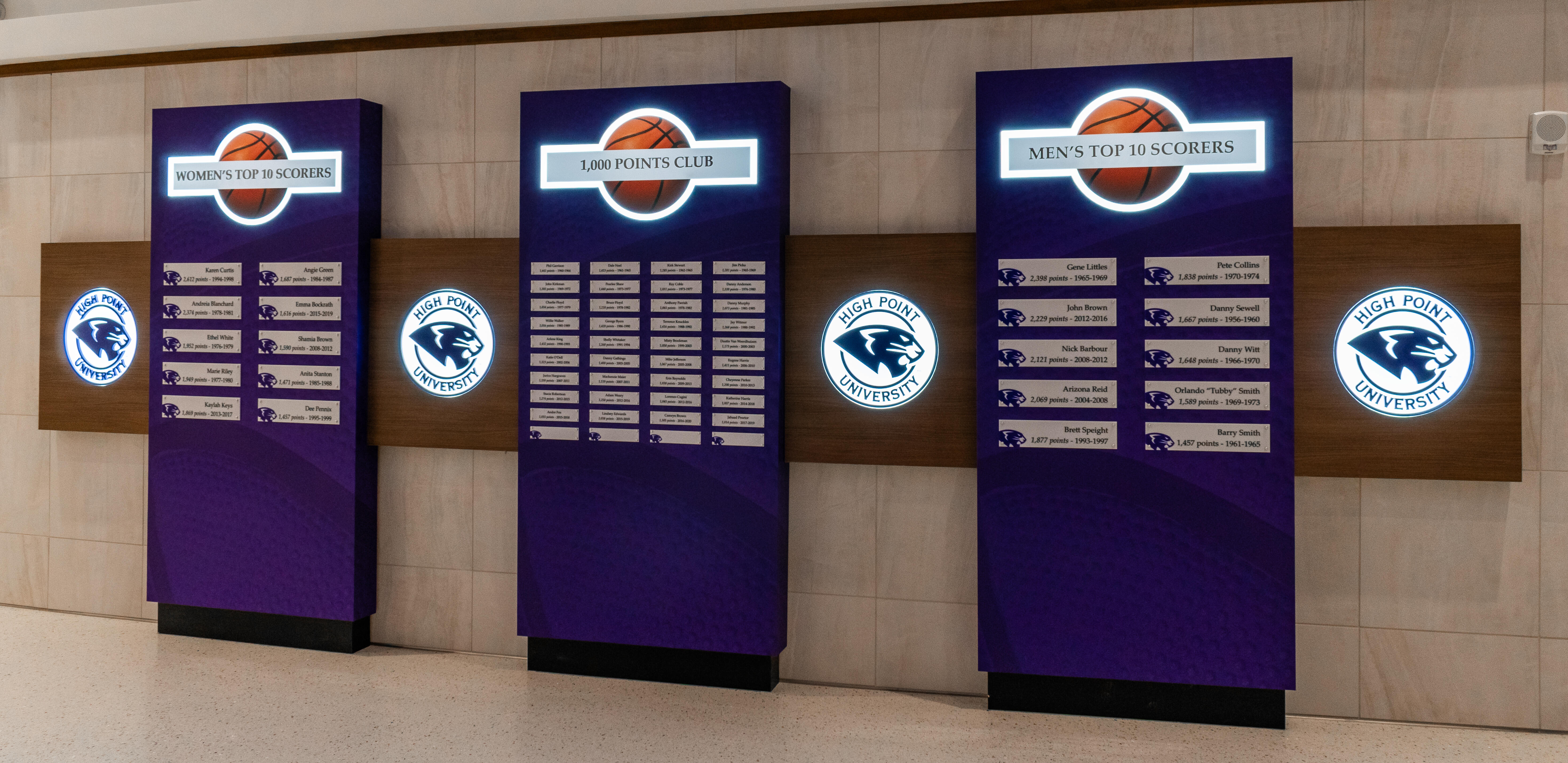 The High Point men’s basketball team has made two NCAA Tournament appearances at the Division II level – coming back-to-back in 1996 and 1997 – while the women’s program made the DII Tournament in 1997, reaching the Sweet 16. In 2021, the women became the first High Point team to qualify for March Madness at the Division I level, although they’d lose 102-59 to top-seeded Connecticut inside the tournament bubble at the Alamodome in San Antonio. The men would later follow suit, with their first tournament appearance coming in 2025 against #4 Purdue. The accomplishments of players from both basketball squads is highlighted all throughout the concourse at the Qubein Center.