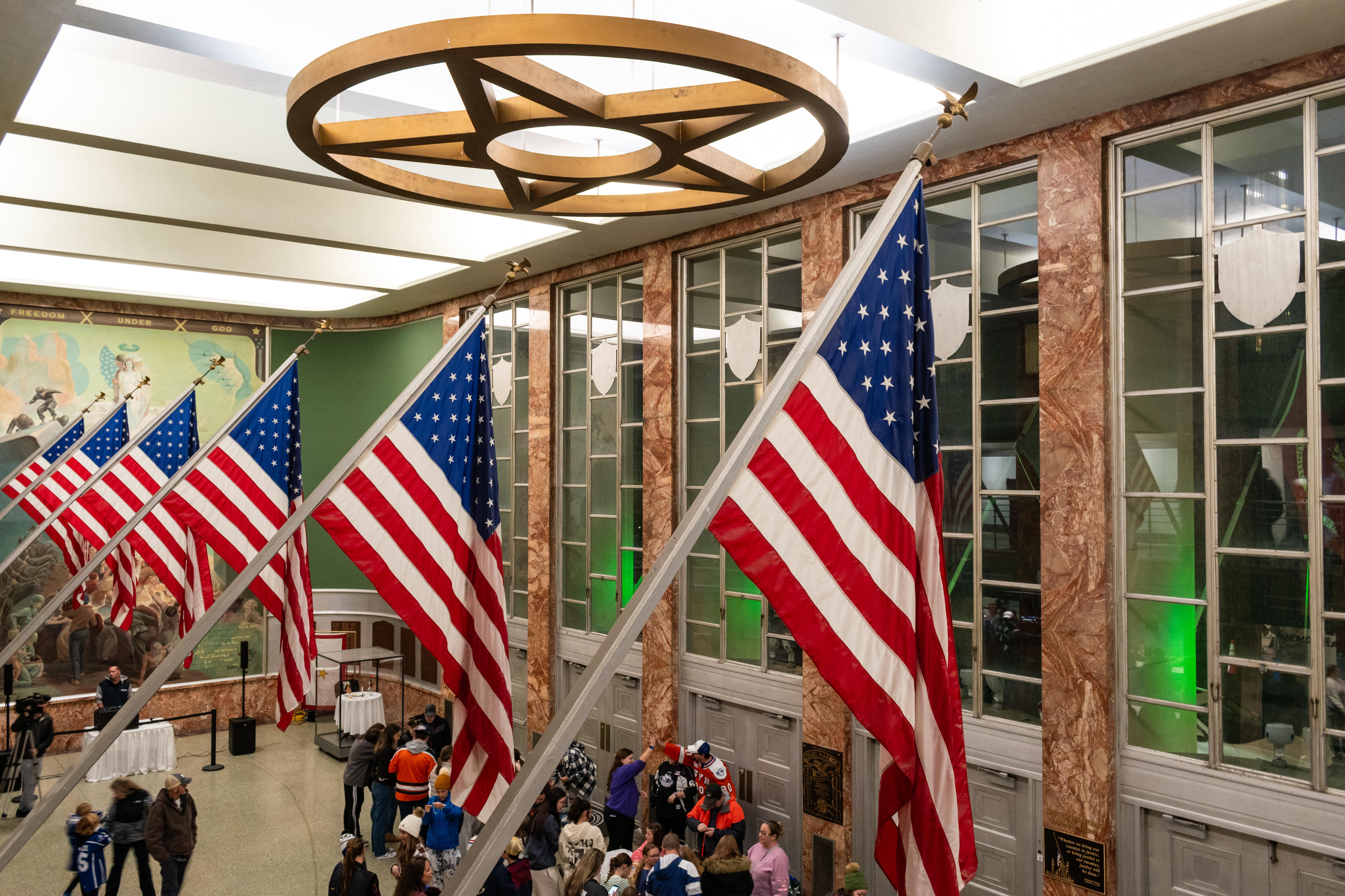 Inside Upstate Medical University Arena, classic art deco finishes adorn the entrances and hallways, spreading nostalgic vibes throughout the building. Plaques and pictures dedicated to veterans of foreign wars are present all around, enshrining those who served our country into the walls of the War Memorial forever. Further, exhibit cases on the lower level are full of military memorabilia and thought-provoking photos.