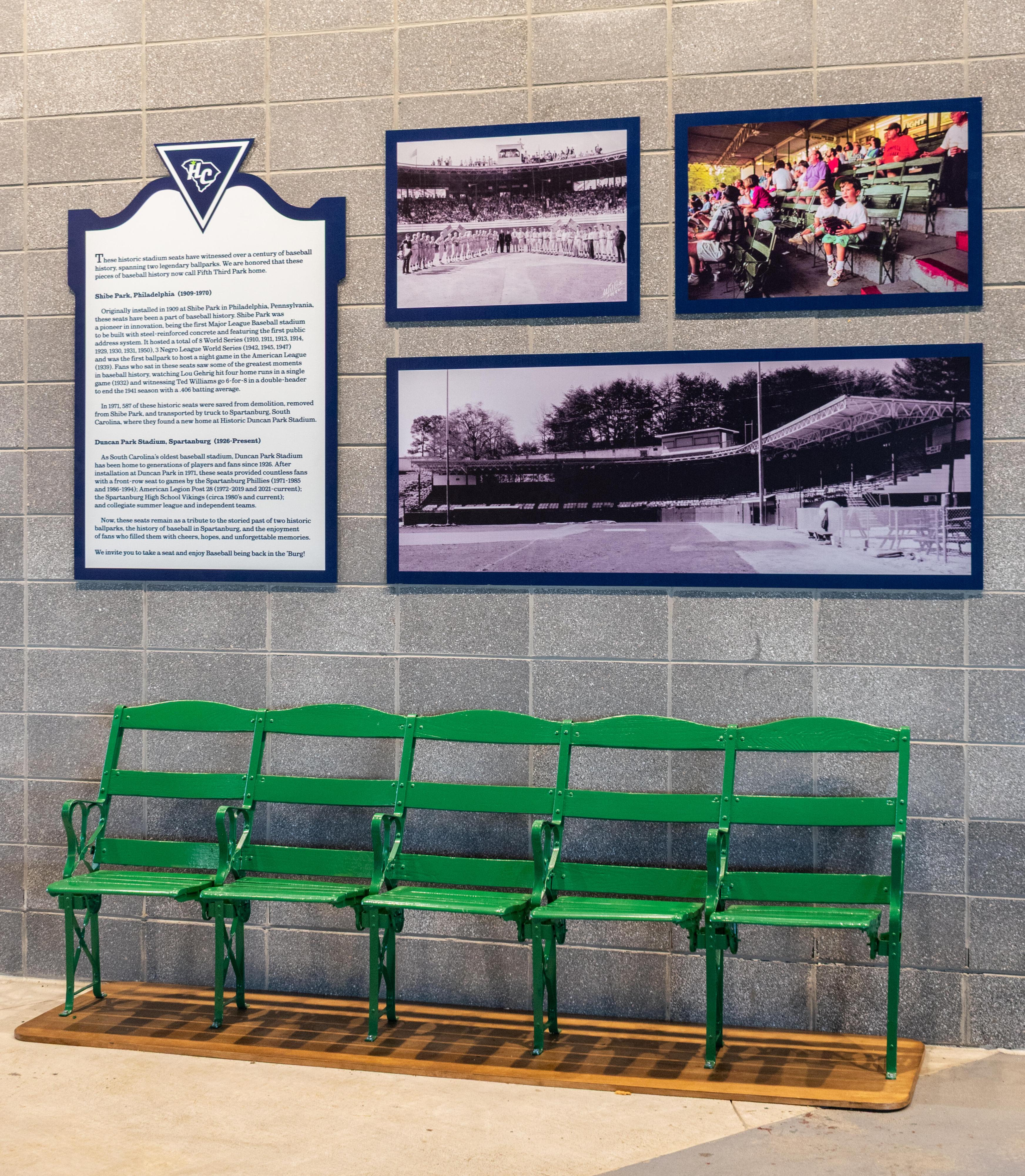 The latter team, although only in existence for a single season, certainly left is mark on the city’s baseball landscape by lending its name to the new minor league franchise that would relocate to Spartanburg from Kinston, North Carolina following the conclusion of the 2024 campaign. This new club, in an effort to be a faithful steward of baseball in the Hub City, honors the teams and players that came before them by displaying an old row of seats that have seen more than a century of action. The seats, originally installed in 1909 at Shibe Park in Philadelphia, were moved down to Spartanburg in the ’70s – which was, at the time, home to the Phillies’ affiliate of the same name – and incorporated into Duncan Park, where they remained in use for several decades.