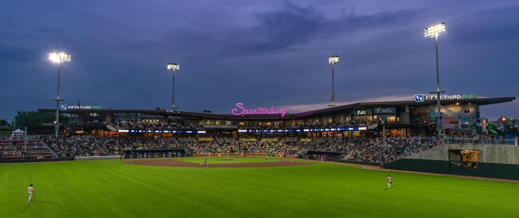 Affectionately nicknamed “The Fraction” by locals and fans, Fifth Third Park emanates strong retro vibes that are derived from the ’50s-era style of the ‘Burgers name and logo. Lime greens and hot pinks are prevalent and diner-esque motifs can be seen all around the ballpark. The most notable is the script “Spartanburg” neon sign affixed to the roof behind home plate. Even outside the stadium, the buildings on the surrounding streets have started trending in the same aesthetic direction. The AC Hotel beyond the left field gate, for example, lights up after the sun goes down in the team’s colors of navy blue and lime green.