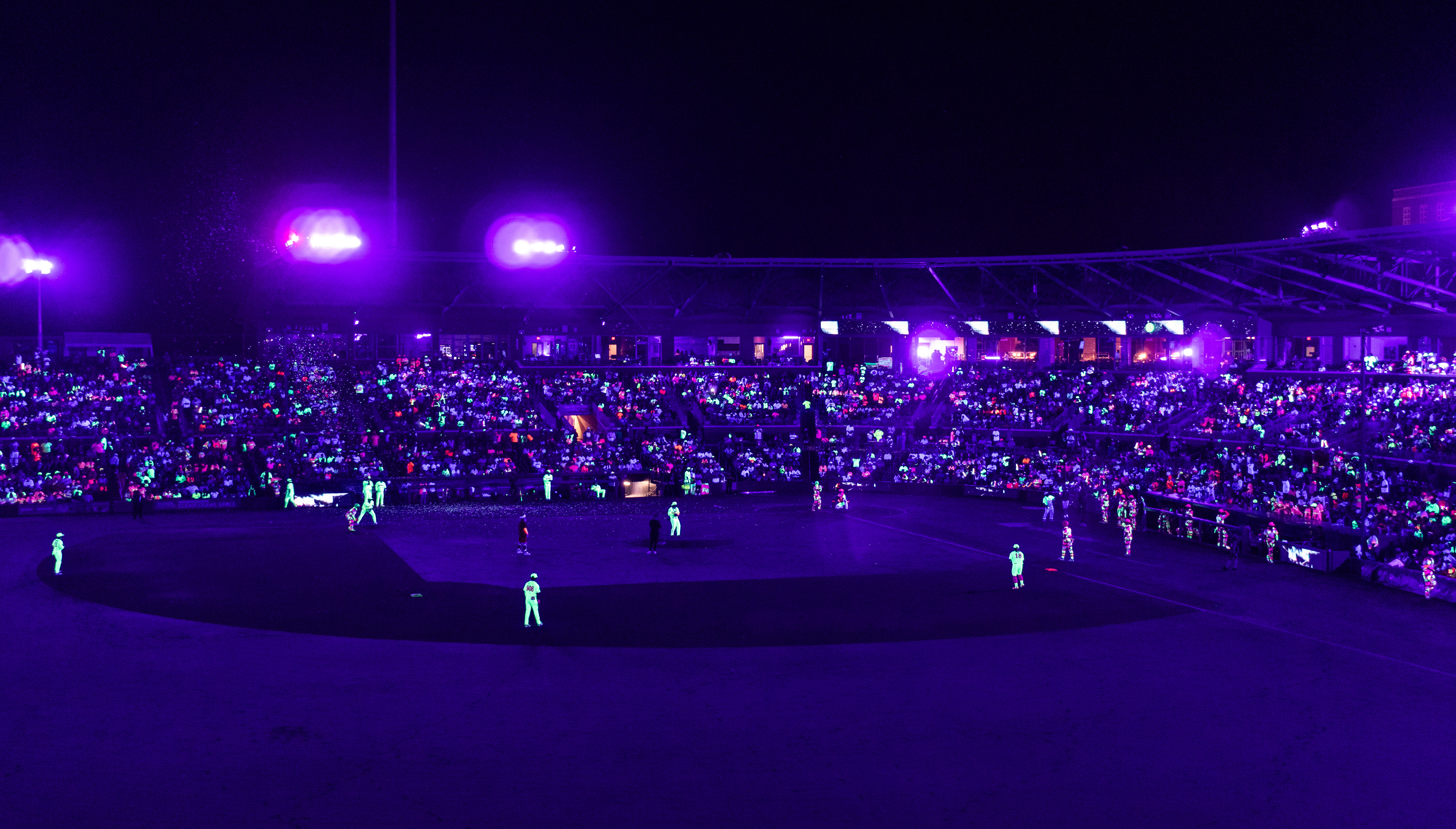 What starts as a somewhat normal baseball game – barring rule-breaking oddities such as running the bases backwards and players swapping positions mid-game – quickly becomes an all-out party on the diamond. Following a “Cosmic Halftime” after the sun dips below the horizon, glow-in-the-dark bases are swapped in for the usual white ones and the real fun begins.