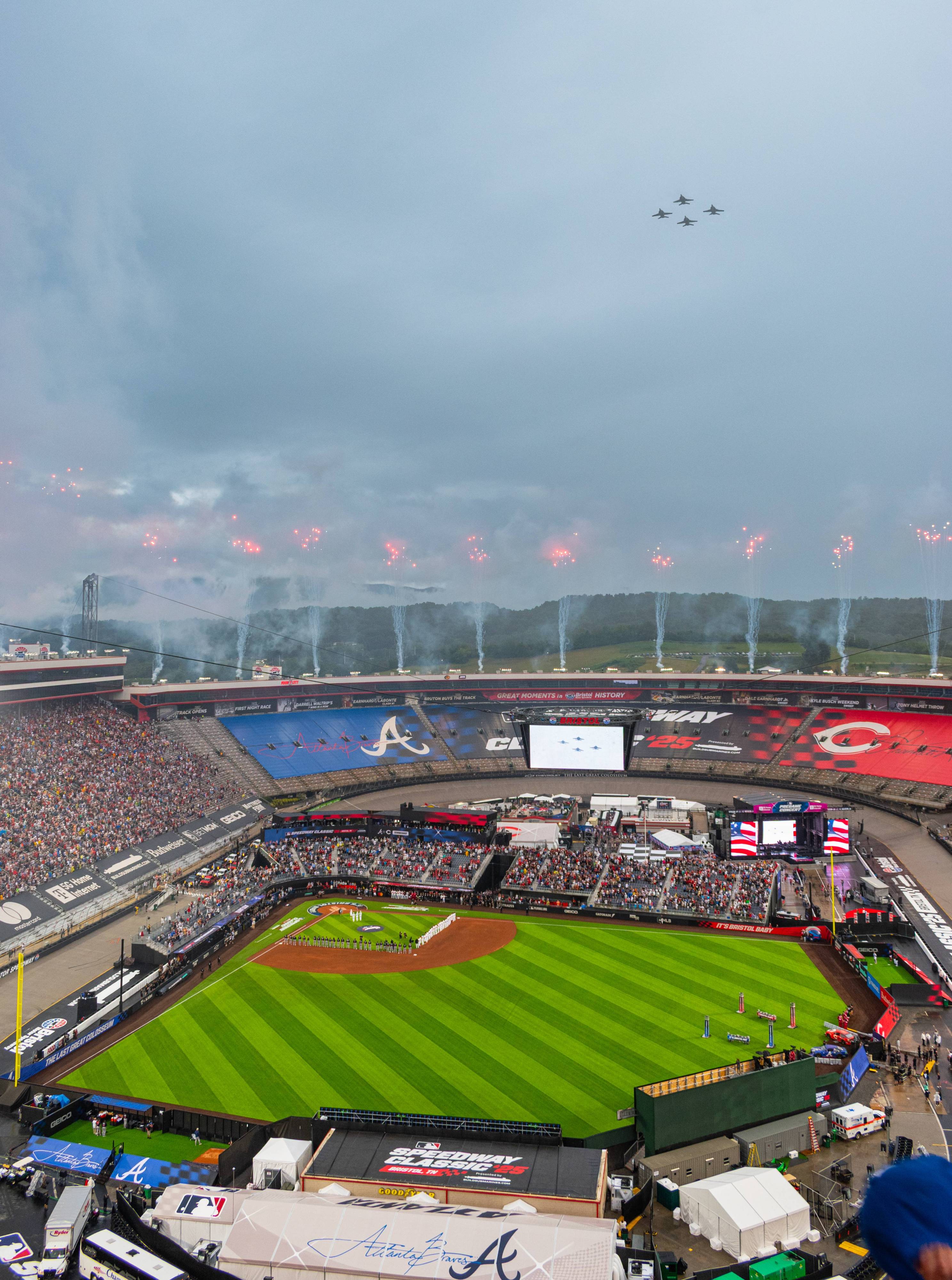 With Great American Ball Park located just 4 miles closer to the track than Truist Park, the Reds acted as the designated home team for the event. They managed to score a run in the top of the 1st inning.