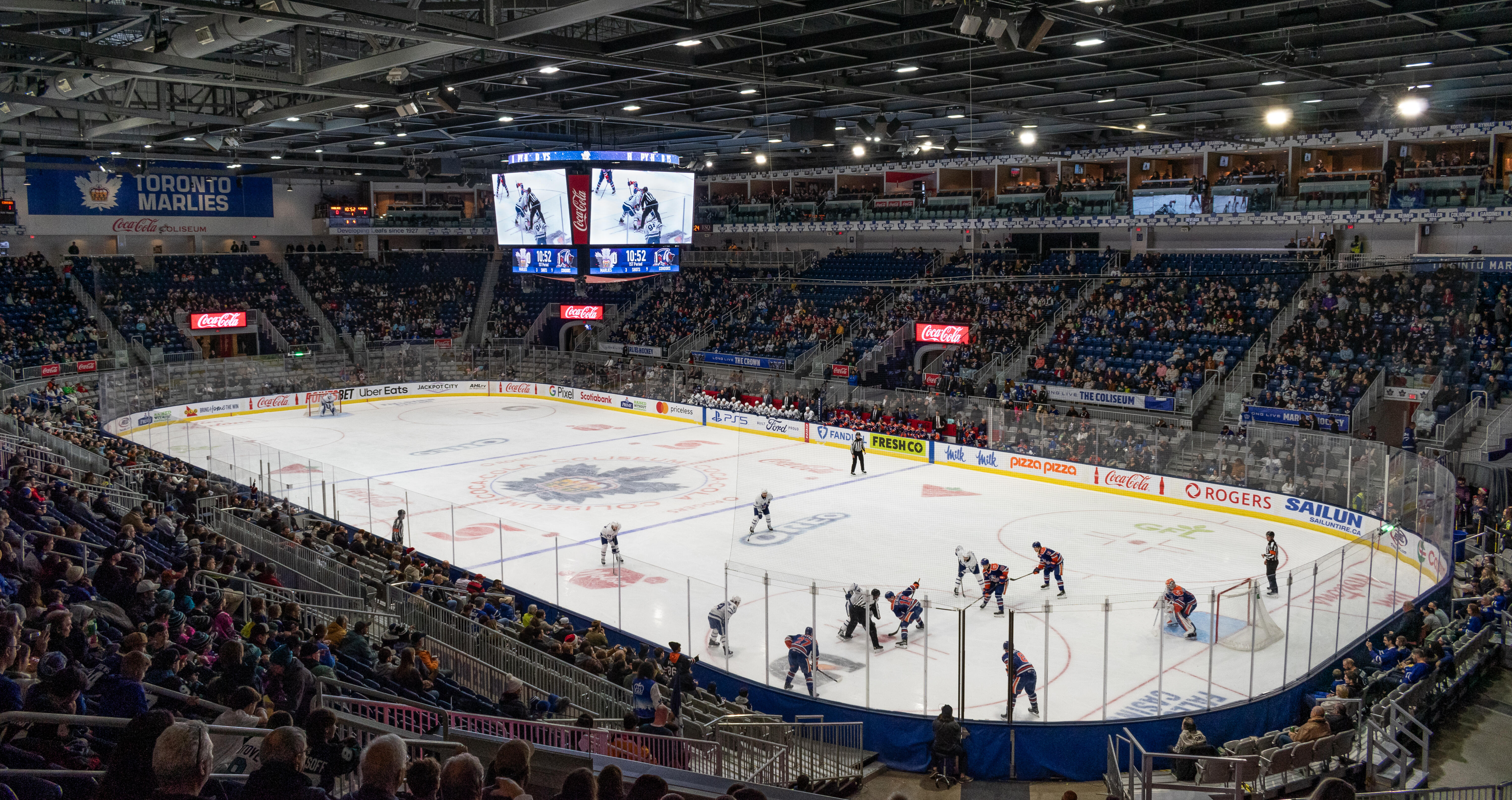 Around the turn of the century, the NHL’s Maple Leafs were looking to place their top-level minor league team at the Coliseum. The barn’s first tenant was the AHL’s Roadrunners, whom the Leafs had moved from nearby Hamilton, but the team only lasted one season. In 2005, a new franchise arrived from St. John’s and took on the Marlies moniker. The team, also a member of the AHL, adopted imagery closely aligned with the branding of its parent club and have been entertaining crowds along the lakeshore ever since.