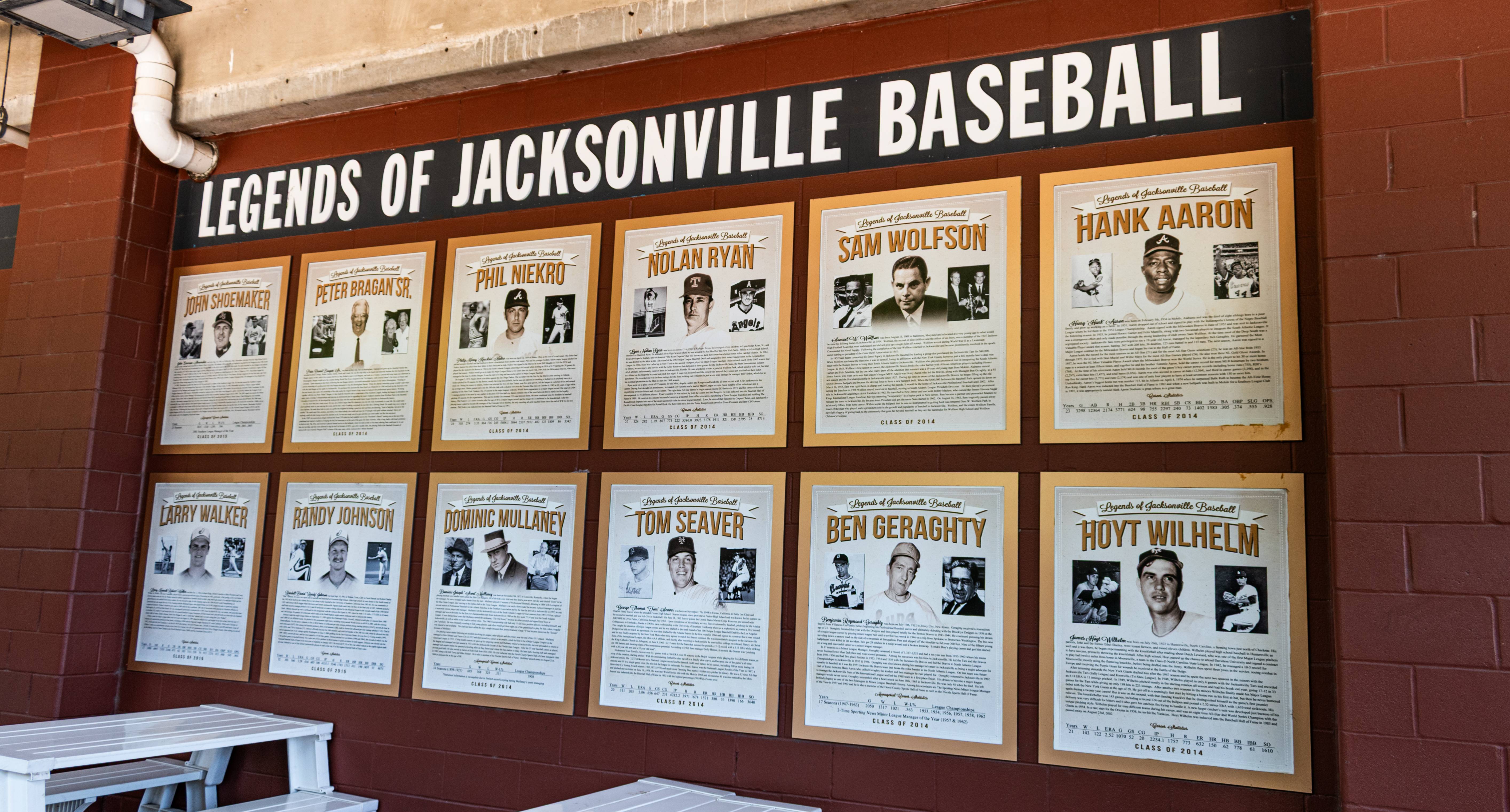 Behind home plate, legendary players and owners who have spent time in Jacksonville are enshrined on informative plaques – from all-timers like Nolan Ryan and Hank Aaron to less widely-known locals such as Peter Bragan Sr. and Sam Wolfson, the latter whose name adorned the Shrimp’s former stadium.
